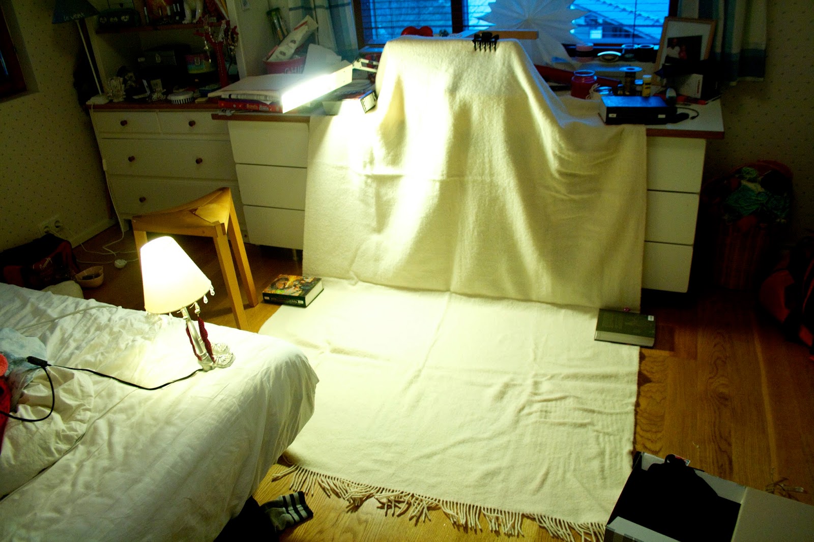Som bakgrund hade jag en vit filt, men det fungerade ju inte riktigt. Bilderna blev helt för gula och jag är inte alls speciellt nöjd med dem. Men ja, så här hade jag ställt upp det i mitt rum.